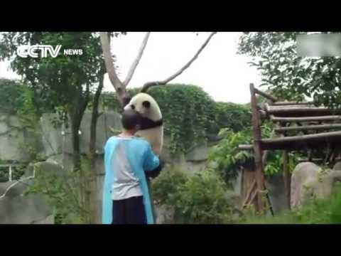 In footage from CCTV News China, a breeder at the Chengdu Research Base of Giant Panda Breeding in Sichuan, China attempts to take a panda bear out of her tree, but she resists him until her motion asking for a hug is granted. Via Laughing Squid